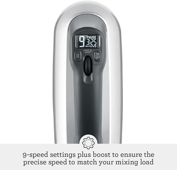 Featuring a 9-speed electronic control system, the mixer automatically adjusts power to maintain consistent speed, even when mixing thick batters or dense dough. This intelligent speed control ensures smooth, splatter-free operation while delivering optimal mixing performance for everything from whipped cream and eggs to cookie dough and cake batter.